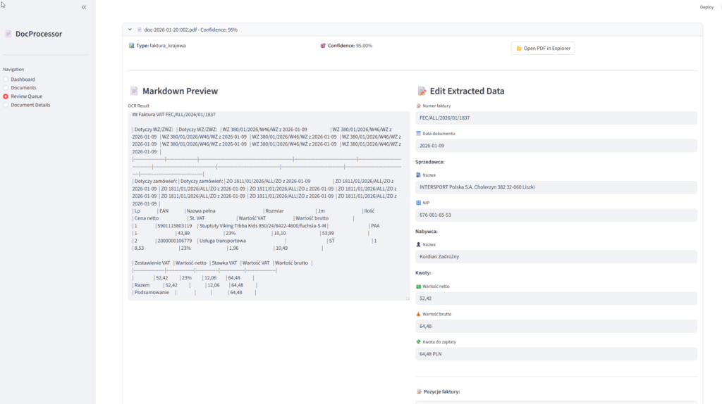 Załączniki do faktur nie trafiają do KSeF. System przyjmuje tylko ustrukturyzowane dane XML. Specyfikacje techniczne, protokoły odbioru, umowy ramowe, kalkulacje kosztorysowe, wszystkie te dokumenty muszą być przechowywane i procesowane osobno. Wiele firm potrzebuje ekstrakcji danych z tych załączników do celów kontrolingowych lub produkcyjnych.