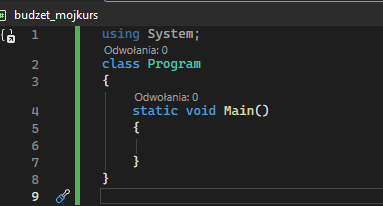 Stworzysz pierwsza świadomą klasę w twoim programie, do tej pory widziałeś taki podstawowy blok:
