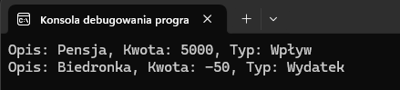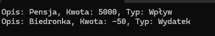 Console.WriteLine($"Opis: {t1.Opis}, Kwota: {t1.Kwota}, Typ: {t1.Typ}");