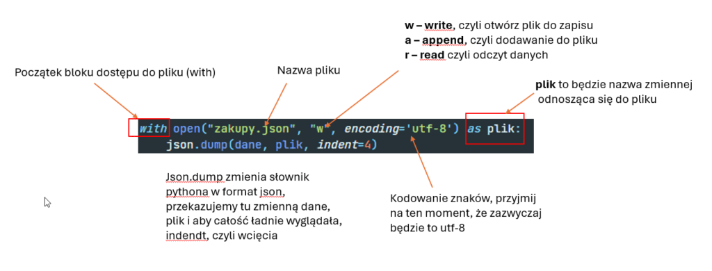 Używamy konstrukcji with open(...). Działa ona jak „samozamykacz” w drzwiach – gwarantuje, że plik zostanie zamknięty po zapisaniu, nawet jak program wyrzuci błąd.