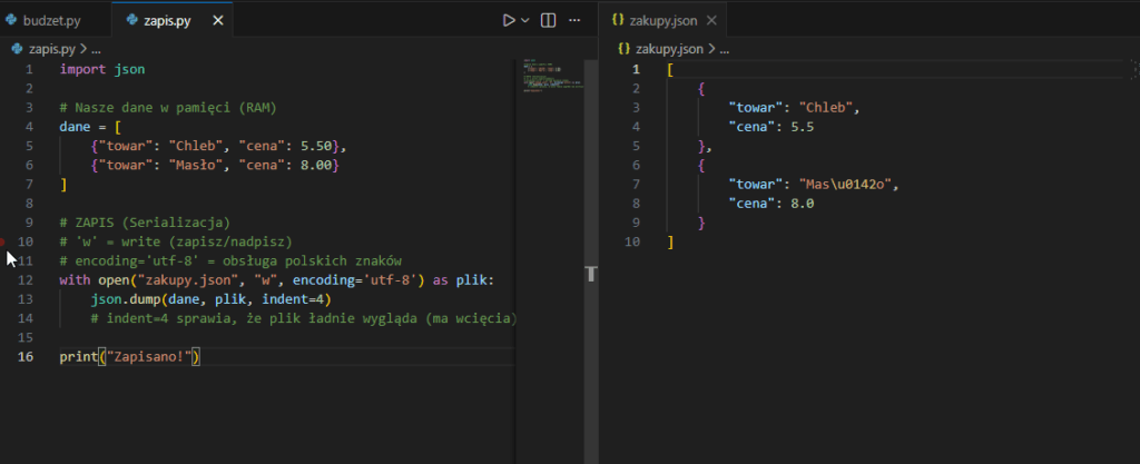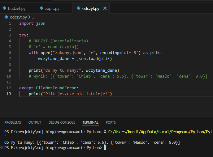 budzet.json. Otwórz go w notatniku. Zobaczysz swoje dane! - Uruchom program ponownie. Twoja pensja tam jest!