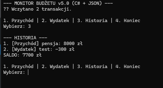 Console.WriteLine("--- MONITOR BUDŻETU v5.0 (C# + JSON) ---");