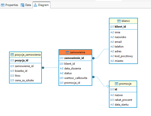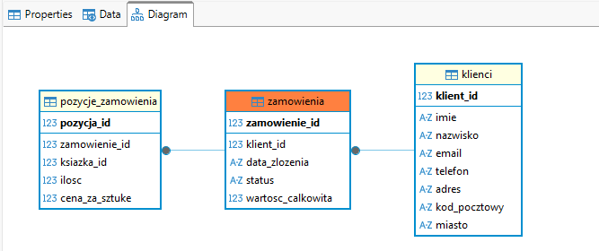 Mamy więc tabelę zamówienia, które w tej chwili powiązane są z tabelami pozycje_zamowienia oraz klienci: