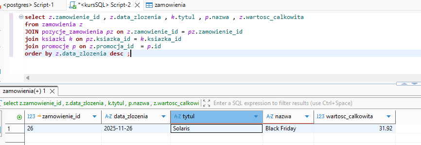 Wybrałem kolumny, z zamówienia, książki aby było widać tytuł, i z join na promocje.