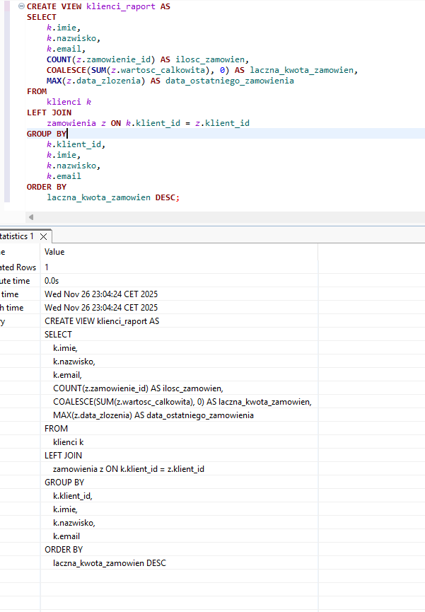 Oto jak to zrobić – przed sam select dodaj CREATE VIEW klienci_raport AS