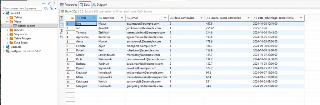 - stwórz sobie kilka raportów, używając wiedzy z poprzednich lekcji, jak obliczanie średniej i inne i stwórz z tego widok.