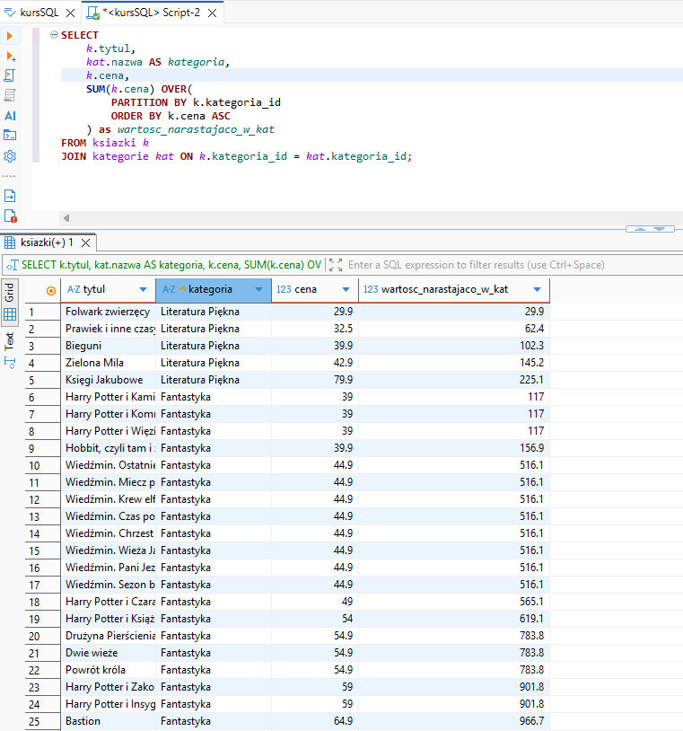 1. Suma narastająca cen książek w kategoriach Zadanie: Pokaż, jak narasta wartość (cena) książek wewnątrz każdej kategorii, od najtańszej.