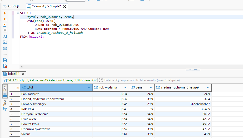 2. Średnia krocząca (ruchoma) cen książek Zadanie: Obok ceny książki wyświetl średnią cenę tej książki oraz 4 poprzednich (chronologicznie).