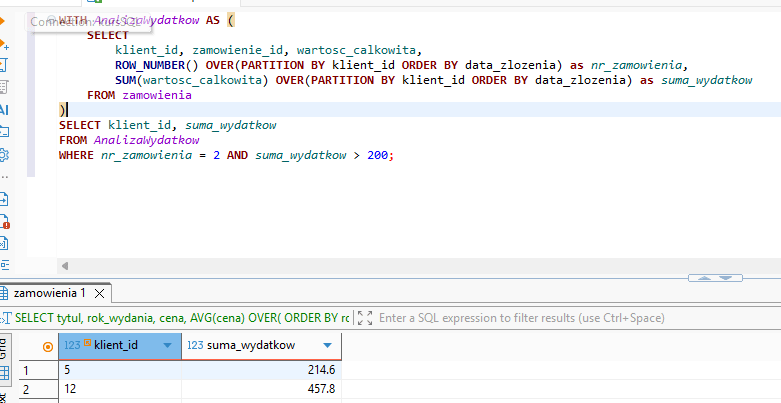LEAD): Korzystając z tabelipozycje_zamowienia, wyświetl listę książek (ksiazka_id) w ramach każdego zamówienia (zamowienie_id), posortowaną np. po ID książki. Obok ID książki wyświetl ID następnej książki na liście w tym samym zamówieniu. (Wskazówka: PARTITION BY zamowienie_id). - Zadanie dla chętnych (Wykrywanie spadków): Znajdź wszystkie zamówienia, których wartość była niższa niż wartość bezpośrednio poprzedzającego je zamówienia tego samego klienta. Wyświetl ID klienta, datę tego „słabszego” zamówienia oraz o ile kwota była niższa (różnica). (Wskazówka: Użyj CTE, w którym obliczysz różnicę za pomocą LAG, a w głównym zapytaniu przefiltrujesz wyniki, gdzie różnica jest ujemna).