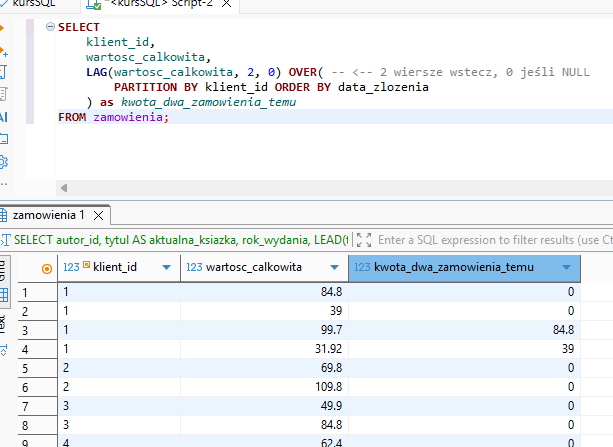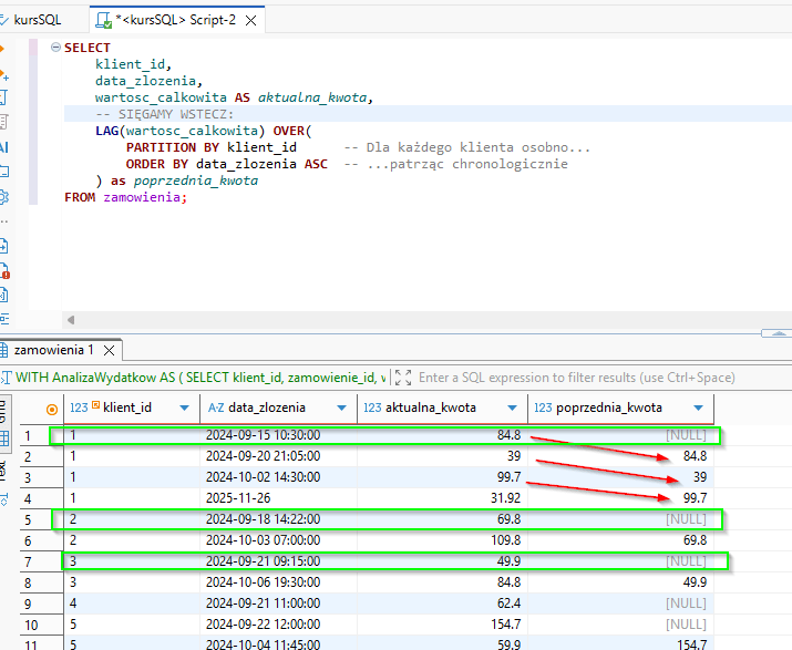 Czyli dzięki tej funkcji masz dostęp wprost do danych z poprzedniego rekordu w danym oknie – tutaj okno jest ograniczone przez klient_id.