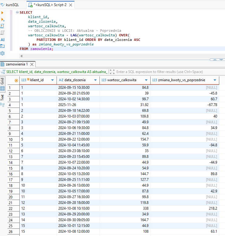 Samo wyświetlenie poprzedniej kwoty to dopiero początek. Prawdziwa moc LAG polega na tym, że możemy użyć tej wartości w obliczeniach matematycznych od razu w SELECT.