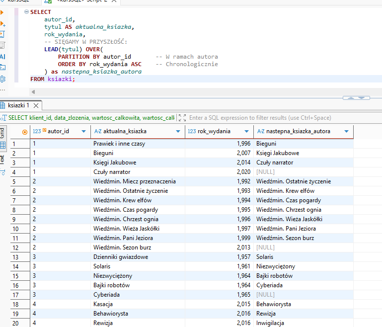 Wynik: Ostatnia książka autora będzie miała NULL w kolumnie nastepna_ksiazka_autora.